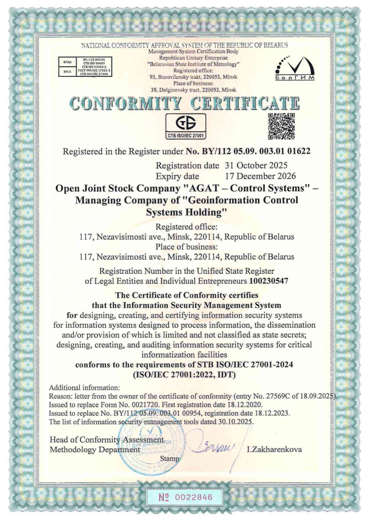 Cybersecurity Center of Open Join-Stock Company “AGAT - Control Systems” which is the managing Company of “Geoinformation Control Systems” Holding provides services of penetration testing of information systems, monitoring of the data security status of IT infrastructure and information systems, incident response in accordance with the requirements of the information security management system STB ISO/IEC 27001-2024.