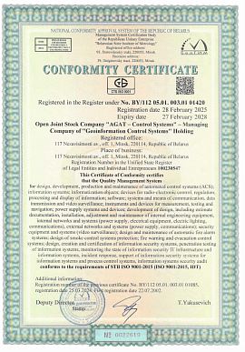 Open Joint-Stock Company “AGAT - Control Systems” – Managing Company of “Geoinformation Control Systems” Holding has developed, implemented and operates the Complex system for ensuring the competitive capacity of the Company. This system is built on integration of requirements and provisions of international standards ISO 9000 series for quality management system, ISO/IEC 27000 series for information security management system, ISO 14000 series for environment management system, ISO 45000 series for occupational health & safety management system, SA 8000 standards for personnel social development management system and others.